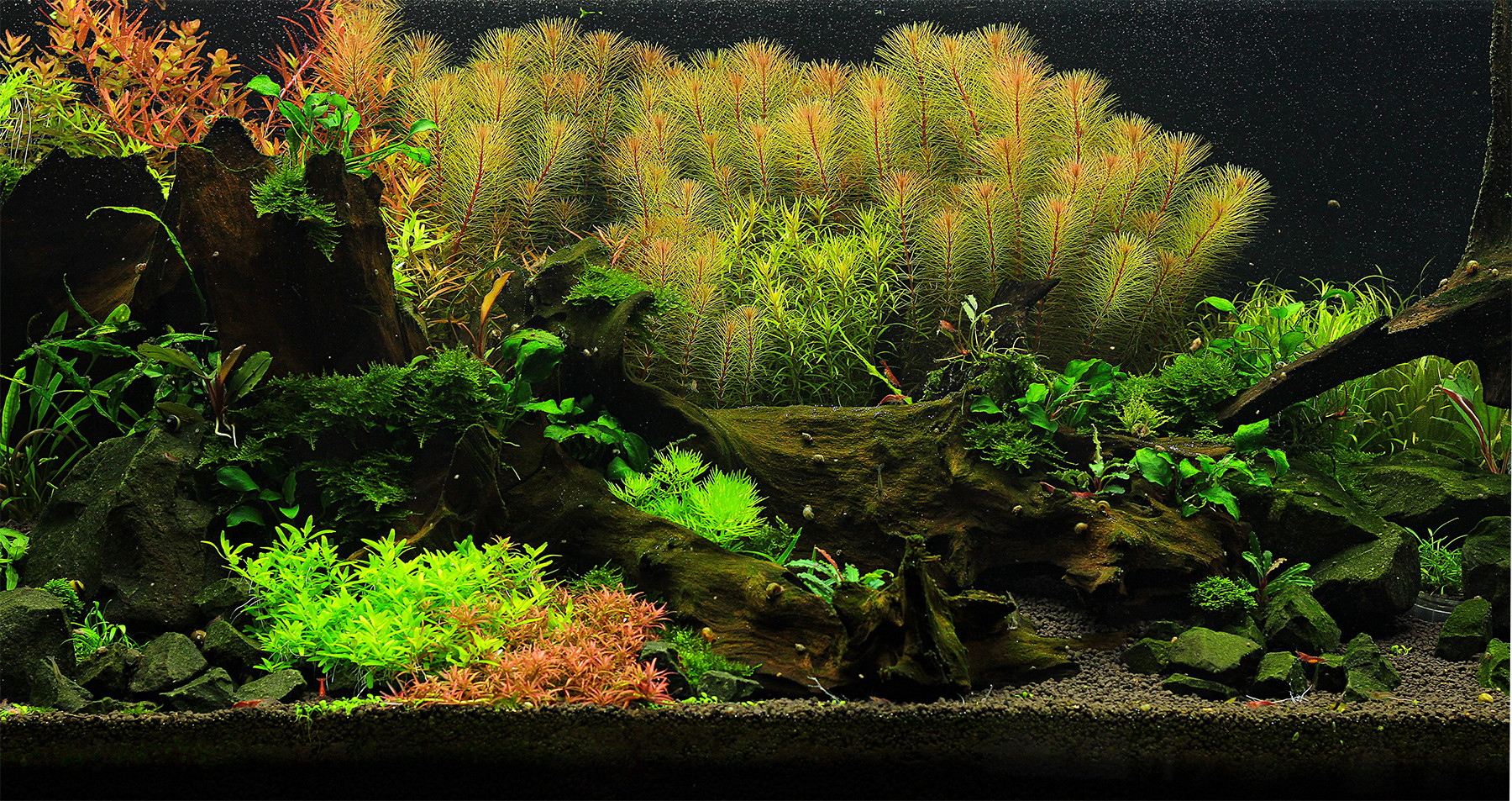 苔藓用于自然水族馆和虾的饲养。它们是非常容易的植物与美丽,深绿色的颜色和细叶。此外,它们为小型鱼类和无脊椎动物提供了许多藏身之处和产卵的可能性。尤其是小虾喜欢吃苔藓。就像附生植物一样,苔藓也像石头或浮木一样固定在坚硬的地面上。附生植物是像蕨类植物,Anubias和Bucephalandras,它们用支架固定住水族馆的装饰。这些植物易于保存,要求不高,被用作水景的中间地带。这个区域通常也包括水生植物,如隐花草或小型植物Echinodorus.